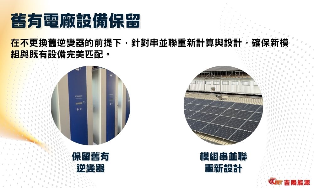 以這次案例來說,除了更換了太陽能模組以及增設維修走道與強化結構,為了保留舊有的逆變器等舊設備,我們重新計算並規劃新舊設備的電氣配置與模組串並聯設計,確保新模組與既有設備完美匹配,進而為業主省下不少費用,實現有限預算發揮最大效益!