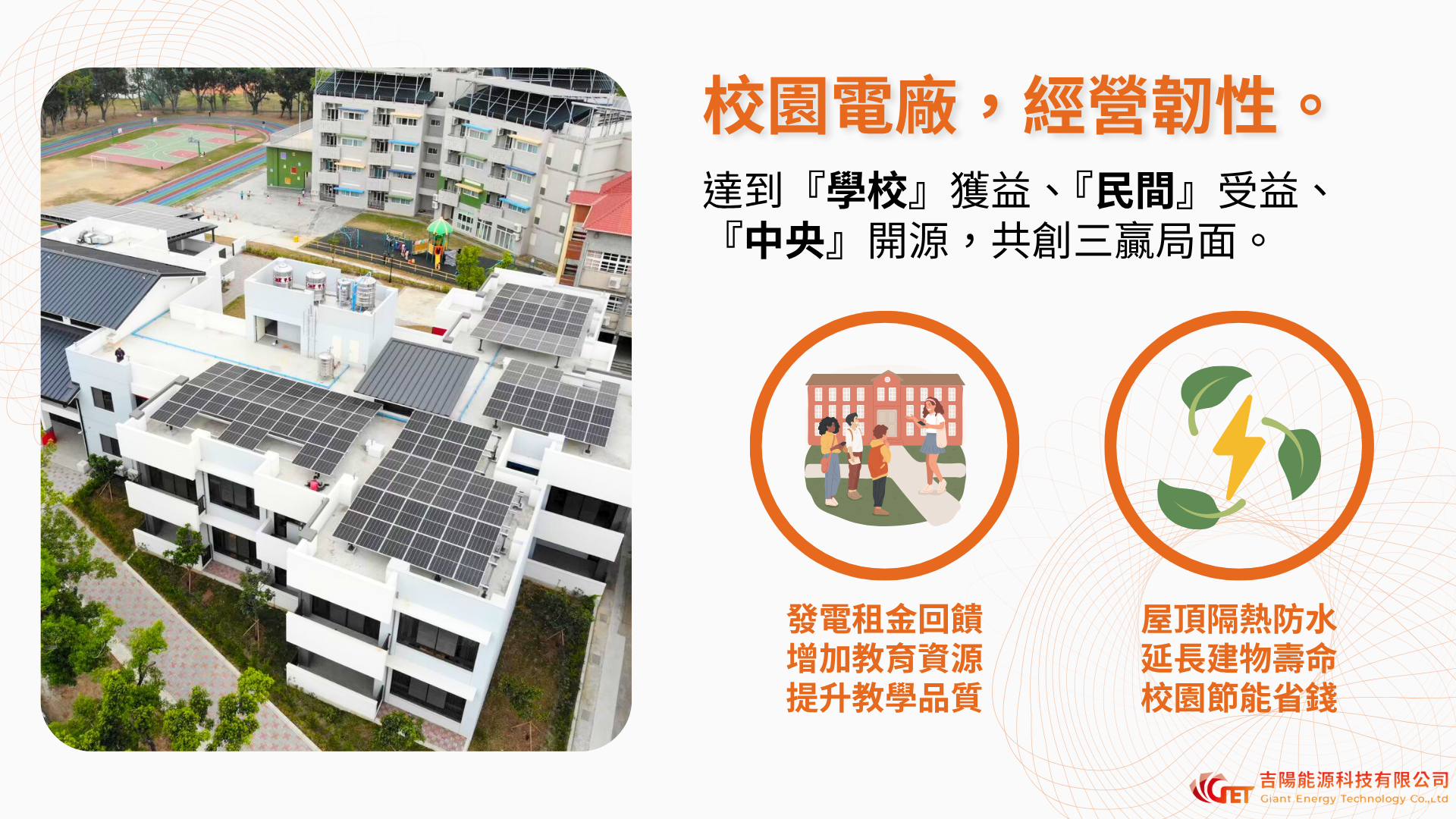 校園因為腹地廣闊,建物四周較少有遮蔽物,所以非常適合建置電廠,也是在公有建築上,常見的屋頂型電廠種類;除此之外透過地方政府與民間電廠合作,還可以達到『學校』獲益、『民間』受益、『中央』開源,共創三贏局面。