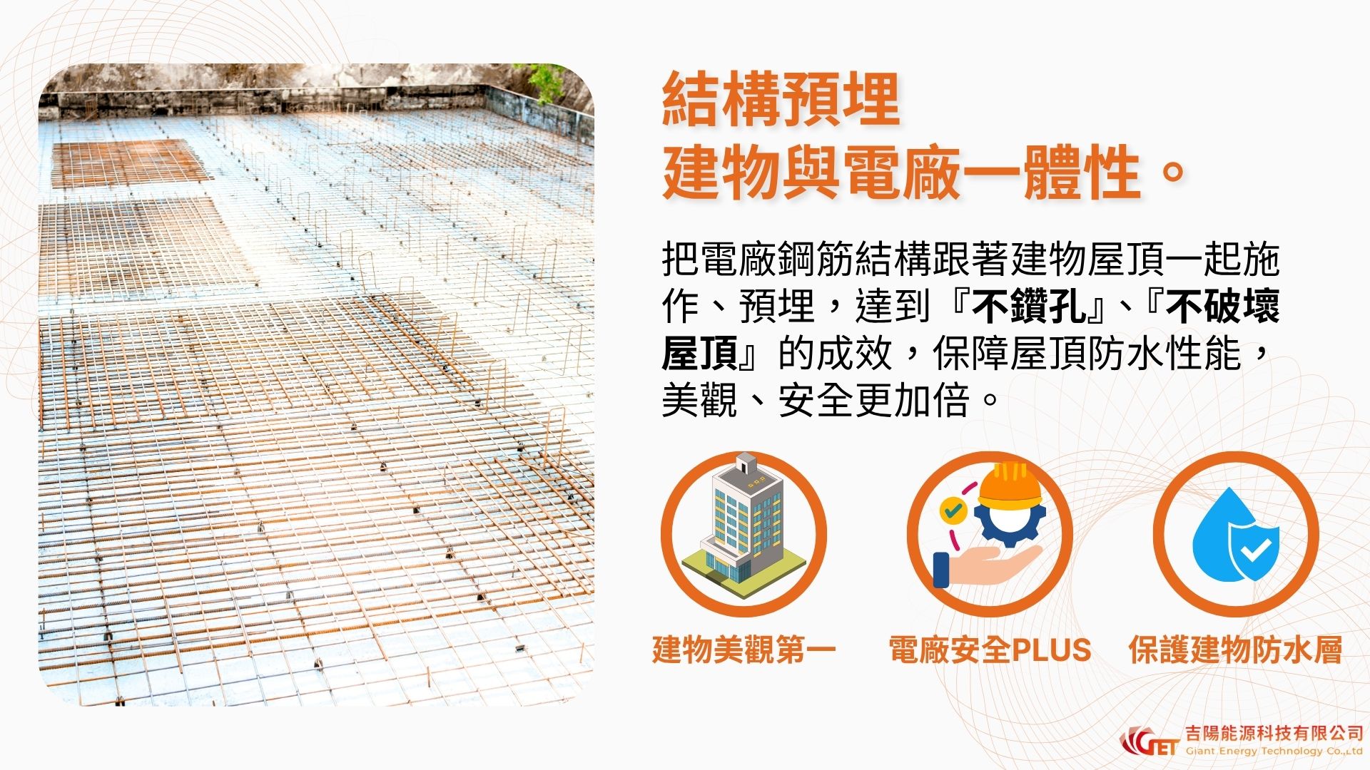 針對RC類型的既有建物,會使用植筋的方式,而吉陽團隊會另外搭配樑柱位植筋工法,因為屋頂層樑柱位置厚度足夠,能確保電廠結構穩固,除此之外還可以減少屋頂層鑽破、裂開等風險,保障屋頂的安全。 - 既有建物的屋頂防水怎麼做?
