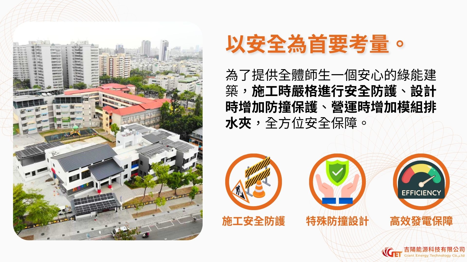 在案廠的施工與規劃上,安全也是本次重點需求,目的是為了提供全體師生一個安心的綠能建築,所以除了上面提到的施工方式、設計規劃,在整個建置過程還有許多巧思。