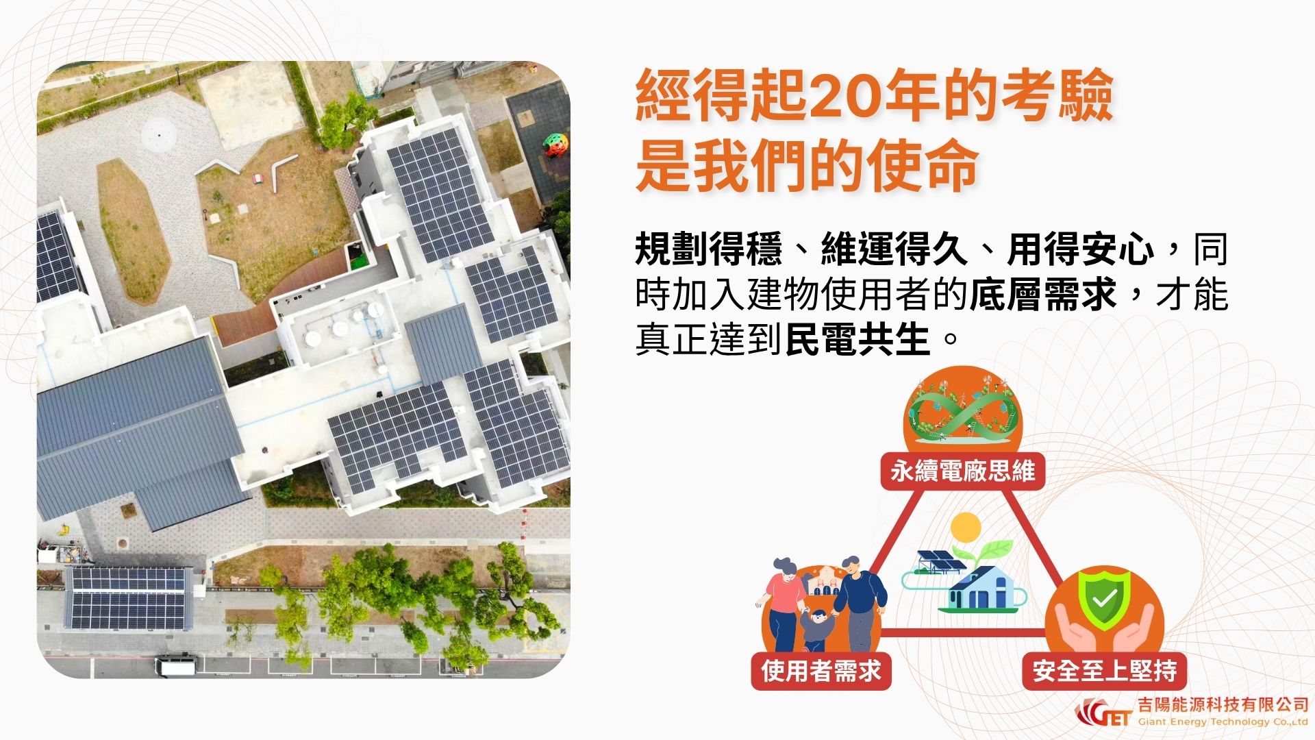 一座好的電廠,其實不是單單從表面來看,也不是一昧把模組鋪好鋪滿才是好電廠,而是規劃得穩、維運得久、用得安心,除此之外更是需要考慮到使用者的底層需求,畢竟使用者是與建物一起朝夕相處,以這次為例,從預埋結構到視覺設計,從隔熱效益到防撞保護,我們希望打造的,不只是會發電的屋頂,更是陪伴師生成長的永續空間,把每個需要都在太陽能電廠上實現,就能真正達到民電共生,發揮『屋頂太陽能』的價值。